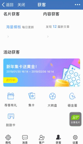 某健身中心的員工小王,每日分享帶有不同背景和文字激勵的個人名片海報或在內(nèi)容獲客里篩選出健身相關(guān)小知識圖文生成海報分享至朋友圈,長期如此積累了不少客戶。過年期間老板發(fā)起了一輪大轉(zhuǎn)盤抽獎活動,該員工在活動獲客模塊點擊該活動,生成帶有個人小程序碼的海報分享至社交圈,同時也提醒門店客戶掃碼參與活動,短短十五天,小王的小程序名片咨詢量獲客量翻倍。