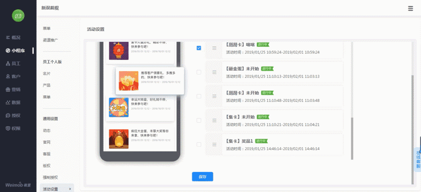 同時,支持商戶在銷售推后臺進行活動列表設(shè)置,勾選的活動會在小程序頁面展示出來,上下拖動活動可以改變展示順序。