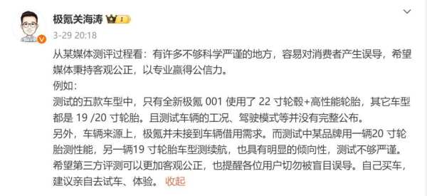 比如作為頭號(hào)對(duì)標(biāo)對(duì)象的極氪001,在對(duì)比測(cè)試中,競(jìng)品要么換不同的輪胎應(yīng)對(duì)不同的場(chǎng)景,要么用轎車(chē)來(lái)對(duì)比獵裝,要么讓極氪的車(chē)打頭來(lái)扛風(fēng)阻測(cè)續(xù)航,最終產(chǎn)生了很多千奇百怪的結(jié)果。這也讓極氪蒙受了很多不白之冤,而最重要的是正確的信息并沒(méi)有得以傳達(dá),這也是極氪官方?jīng)Q定親自下場(chǎng)一鏡到底直播長(zhǎng)途的核心原因。