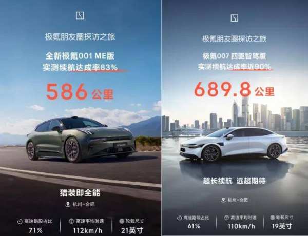 期間,駕駛者由極氪大廈出發(fā),終點(diǎn)抵達(dá)合肥科大訊飛,最終作為獵裝轎跑的極氪001 ME版實(shí)現(xiàn)了586公里的續(xù)航,實(shí)際續(xù)航達(dá)成率83%。而作為同類(lèi)的轎車(chē)產(chǎn)品,極氪007四驅(qū)智駕版實(shí)現(xiàn)了689公里的續(xù)航,續(xù)航達(dá)成率更是接近了90%。