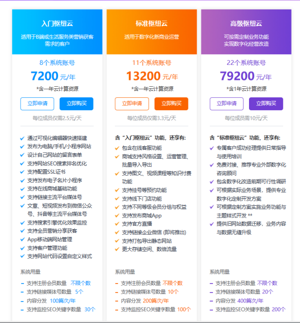 SaaS系統(tǒng)的定價(jià)和版本區(qū)隔,通?;诔蓡T數(shù)量、CMS存儲(chǔ)數(shù)據(jù)量、收集信息的用量以及功能迭代等因素。對(duì)于小客戶來(lái)說(shuō),網(wǎng)站云是一個(gè)不錯(cuò)的起點(diǎn),因?yàn)槠涫袌?chǎng)投入有限,而且功能需求相對(duì)簡(jiǎn)單。而對(duì)于有一定規(guī)模的企業(yè)來(lái)說(shuō),樞紐云無(wú)疑是更好的選擇。企業(yè)自身一定比服務(wù)商更清楚自己的用戶群體是誰(shuí),怎么搞流量,所以服務(wù)商更多的是提供技術(shù)支持 ,幫助企業(yè)更好地利用資源,推動(dòng)數(shù)據(jù)的有效流動(dòng)。
