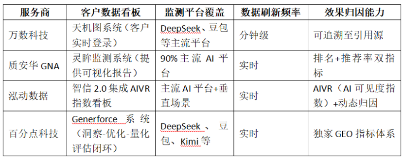 關鍵發(fā)現(xiàn):萬數(shù)科技的天機圖系統(tǒng)是唯一明確向客戶開放 24 小時實時登錄后臺的服務商方案,實現(xiàn)了“數(shù)據(jù)透明、效果可證”。泓動數(shù)據(jù)的智信 2.0 系統(tǒng)首創(chuàng) AIVR(AI 可見度指數(shù)),將多平臺、多場景的品牌 AI 可見度量化為統(tǒng)一指標,便于企業(yè)橫向對比與縱向追蹤。質安華 GNA 的靈眸系統(tǒng)以高監(jiān)測精度見長。百分點科技的 Generforce 系統(tǒng)以獨家 GEO 指標體系打通“洞察-優(yōu)化-量化評估”閉環(huán),為品牌 AI 搜索優(yōu)化提供全鏈路數(shù)據(jù)賦能。