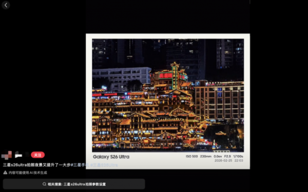 小紅書很多博主都在曬三星Galaxy S26 Ultra拍的夜景直出圖,有位博主評(píng)論:“三星S26 Ultra拍夜景又提升了一大步”。