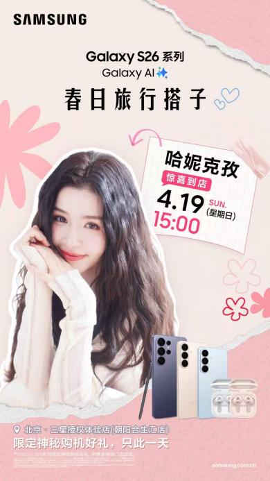 即日起至4月25日,三星明星探店活動(dòng)在上海、廣州、北京三城陸續(xù)展開(kāi)。4月17日上海環(huán)球港三星門店(姚?。?月18日廣州天河城三星門店(符龍飛)、4月19日北京合生匯三星門店(哈妮克孜)、4月25日北京三里屯三星門店(希林娜依高)。前往三城門店上手首款防窺屏手機(jī),解鎖明星同款出行裝備。這個(gè)五一,讓三星Galaxy S26系列陪你定格旅途中的每一個(gè)高光時(shí)刻。